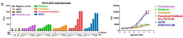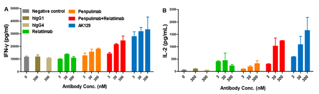 细胞试验显示,PD-1/PDL-1和/或LAG-3/MHCII信号转导会抑制PBMC的活化,而阻滞PD-1和/或LAG-3将促进PBMC的IL-2和IFN-γ应答。AK129在试验中显著增强了PBMC分泌IFN-γ和IL-2的功能,其活性强于派安普利单抗,甚至是派安普利单抗+Relatlimab的联合疗法。