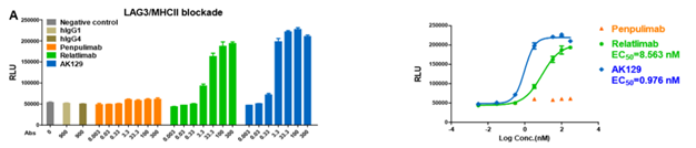 PD-1及LAG-3作为免疫检查点分子,其信号通路的激活可诱导免疫抑制。AK129可顺利获得高效能的阻滞PD-1和LAG-3及其配体的相互作用,进而阻断LAG-3/MCHII和PD-1/PD-L1信号通路的激活。