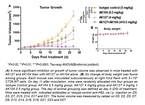 在动物试验中,AK127可抑制BALB/c-hPD-1/hTIGIT转基因小鼠的肿瘤生长。且与单独使用AK127或卡度尼利相比,在AK127+AK104联合处理的小鼠中观察到对肿瘤体积生长的更显著的抑制。