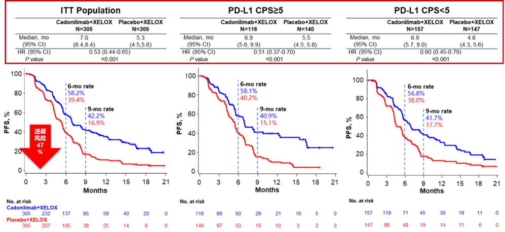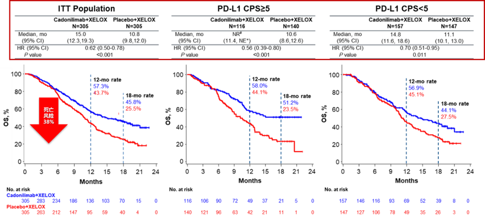 可以看到,COMPASSION-15研究中卡度尼利单抗联合化疗组入组了较高比例的预后较差的患者,包括≥65岁、ECOG PS 1、原发肿瘤位置为胃食管结合部、肝转移、CPS<1、CPS<5的患者,但仍然取得了亮眼的一线治疗生存获益。COMPASSION-15研究中针对PS=1的患者,OS HR=0.60,降低了40%的疾病死亡风险,令人振奋;针对原发灶位置为胃食管结合部的患者OS HR=0.59,针对肝转移患者的OS HR=0.50,实属不易。此外,卡度尼利单抗联合化疗组在PD-L1高表达或低表达患者中均显著获益,可大幅降低疾病进展或死亡风险,具有高肿瘤缓解效力,而且不良反应谱保持一致,未发生特殊不良反应。