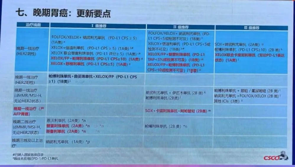 对于晚期胃癌的免疫治疗,现状是随着PD-L1表达增高,患者临床获益趋势增大,多项III期研究结果都显示PD-L1低表达患者一线免疫联合治疗难以获益。但在COMPASSION-15研究中,无论是PD-L1 CPS≥5还是PD-L1 CPS<5人群,都可以取得OS获益,新版指南中也为其追加了新的注释。新版指南中同样更新关于免疫的多项联合方案推荐,对AFP型罕见亚型胃癌,一项前瞻多中心II期AFPGC研究提示了靶免方案的方案,该方案也取得了针对此类患者的II级推荐。在二线治疗中,现在暂无证据支持PD-L1表达作为免疫治疗的指导,II期RAP试验显示雷莫西尤单抗和紫杉醇联合阿维鲁单抗治疗在经治患者的二线治疗中显示出良好的疗效和耐受性,卡度尼利单抗联合普罗西单抗±化疗的临床研究也将于2024年ASCO报告,有望为免疫耐药患者提供更高效的解决方案。