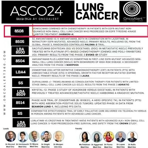 HARMONI-A的主要研究者,中山大学肿瘤防治中心张力教授在ASCO大会现场以Oral报告的形式,将这项全球首个PD-1/VEGF双抗在肺癌中的首个Ⅲ期临床研究阳性结果向全球发表。值得留意的是,HARMONI-A的这项Oral被国际肿瘤互助组织OncoAlert评为本届ASCO肺癌领域TOP 10 榜单的首位报告。