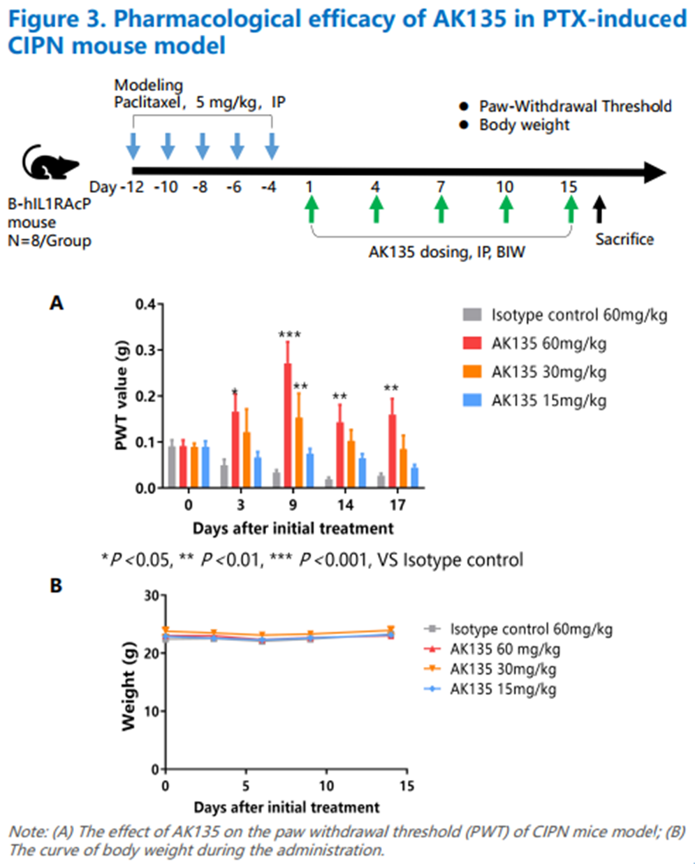 • 疼痛缓解显著:AK135治疗后,CIPN模型的撤爪阈值(paw withdrawal threshold,PWT)显著提高,表明其能有效缓解机械性痛觉超敏,且疗效呈剂量依赖性。