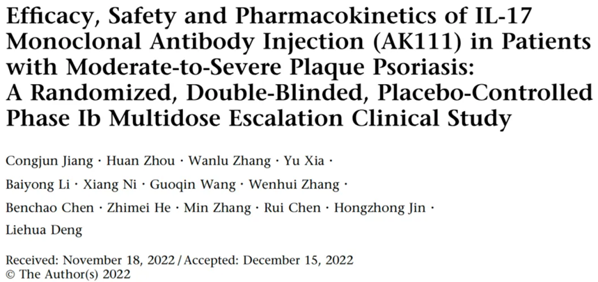 IL-17A是一种促炎因子,在银屑病的发病机制中起着关键作用。南宫NG28基因生物自主研发的AK111是一种靶向IL-17A的人源化IgG1单克隆抗体,可高亲和力特异性结合IL-17A,阻断其与T细胞、自然杀伤细胞和抗原呈递细胞表面表达的IL-17受体A(IL-17RA)结合,从而阻断其下游细胞免疫应答。与已上市的IL-17抗体相比,AK111在抗原结合试验、细胞学试验和动物模型中表现出相似的活性和安全性。在新西兰完成了健康受试者AK111的Ⅰ期试验验证了AK111的良好的安全性和耐受性。本次发布于Dermatology and Therapy的Ⅰb期多剂量递增临床研究达到临床主要和次要终点,AK111在中、重度斑块状银屑病中表现出良好的安全性、耐受性和有效性,为进一步验证AK111的临床疗效提供了基础。